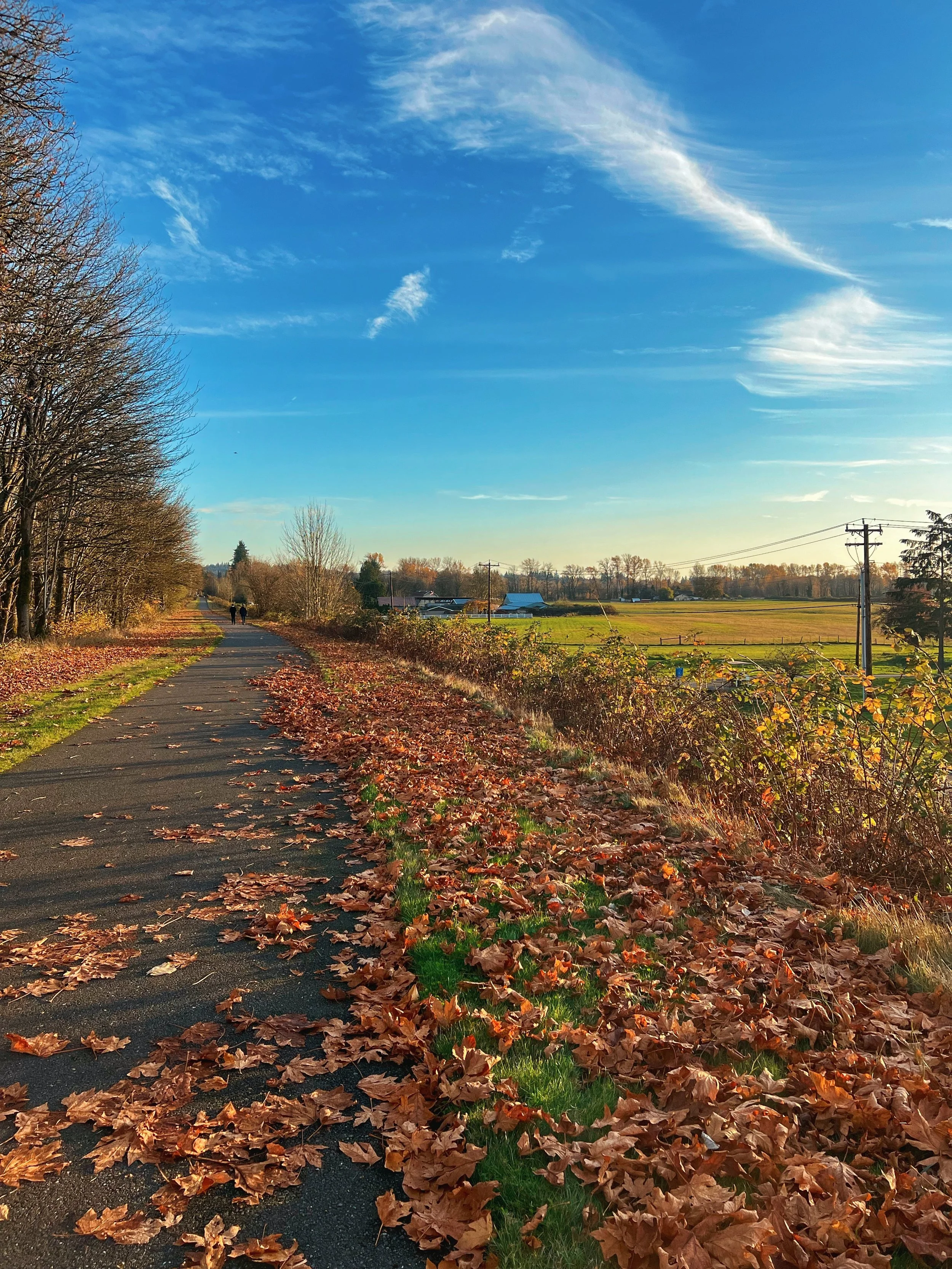This trail feels more remote than the Burke-Gilman without actually being hard to access. You're riding through open farmland with mountain views - a nice contrast to urban Seattle. The width of the trail means you're not constantly dodging other cyclists or pedestrians, and in winter it can feel like you have the whole thing to yourself.